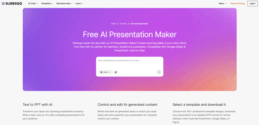 You can generate presentations of up to 20 slides per file using basic AI models. It’s the perfect budget presentation tool for teachers who need to turn a short news article or a page of messy brainstorming notes into a quick visual aid for a bell-ringer activity. You get access to a library of education-specific templates that cover various classroom styles—from "Classic Chalkboard" to "Modern STEM Lab."