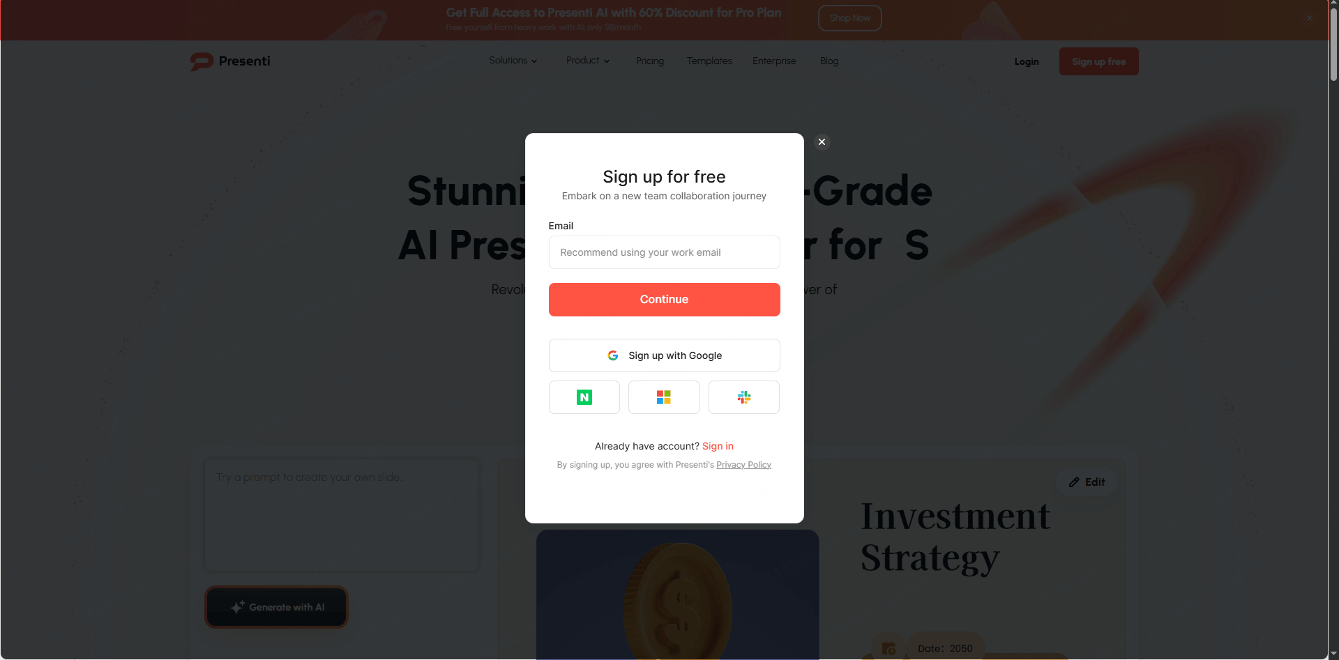 Head to presenti.ai and create a free account. The onboarding is minimal: no lengthy setup, no tutorial gates blocking you from the actual product.