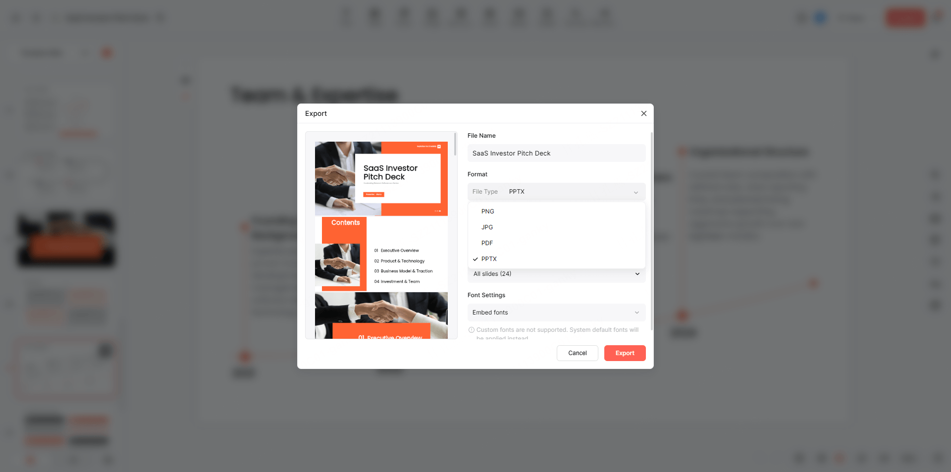 When you’re done, export the finished presentation as a clean PPTX file that opens without formatting issues in PowerPoint, or save it as a PDF if that fits your workflow better. No cleanup required on the other end.