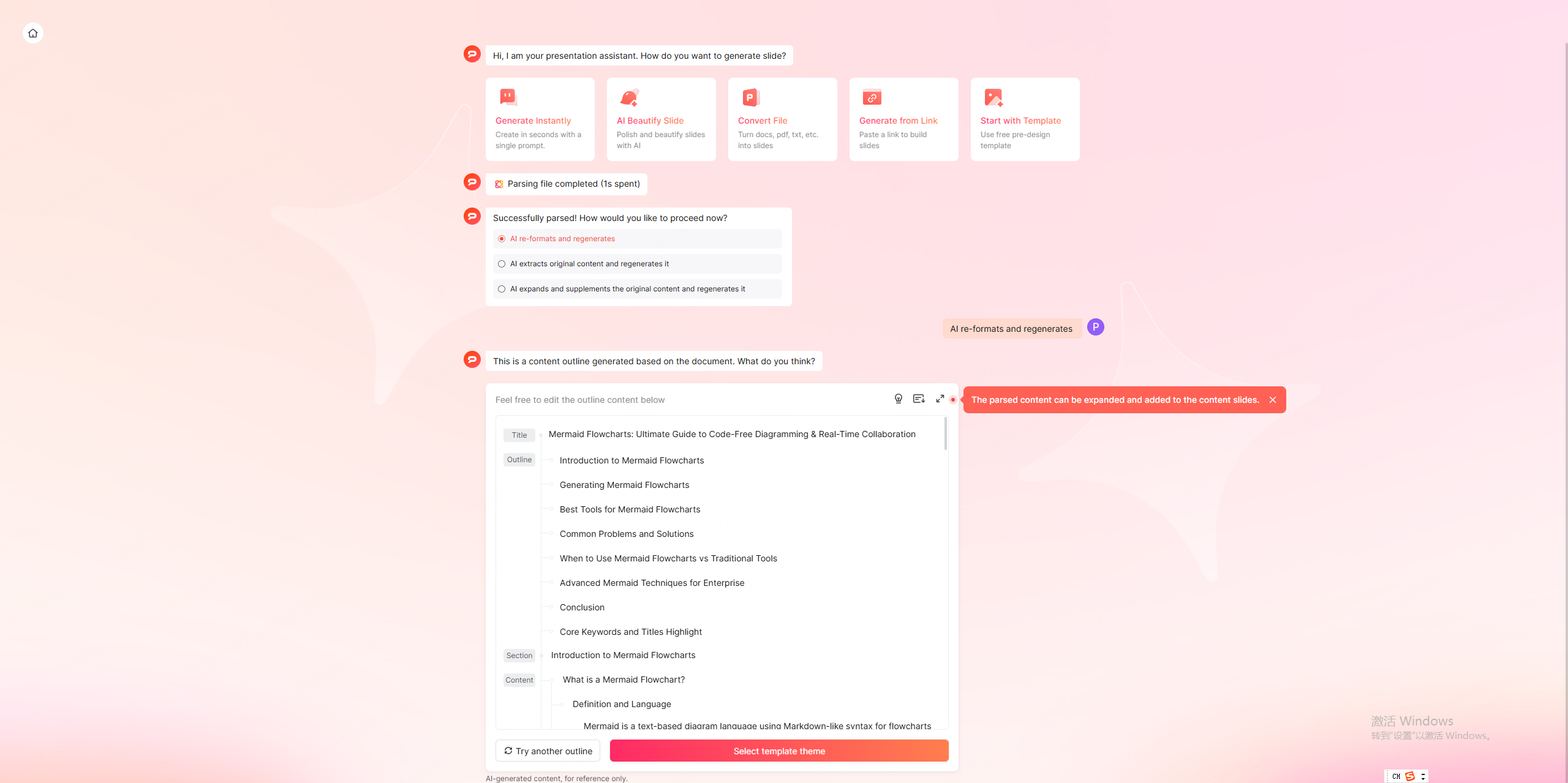 Finishing: Sie müssen lediglich das Design-Thema wählen. Die KI schlägt passende Bilder vor, generiert Sprechernotizen für Ihren Vortrag und formatiert die Finanztabellen in übersichtliche Grafiken um.
