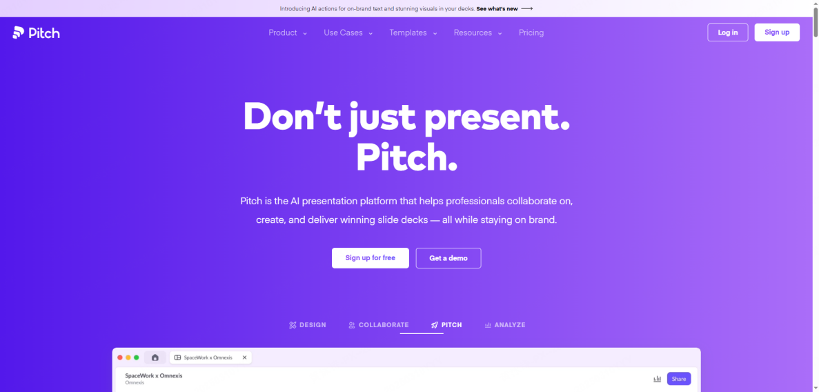 Pitch se concentre sur la collaboration d’équipe. Il permet à plusieurs utilisateurs de travailler simultanément sur une présentation, avec suivi des commentaires et suggestions en temps réel. Cette plateforme est une alternative à Prezi intéressante pour les équipes professionnelles, mais la génération automatique de contenu et les options d’IA restent moins développées que dans Presenti. Elle est particulièrement adaptée pour les présentations d’entreprise nécessitant un suivi précis et une coordination des équipes.