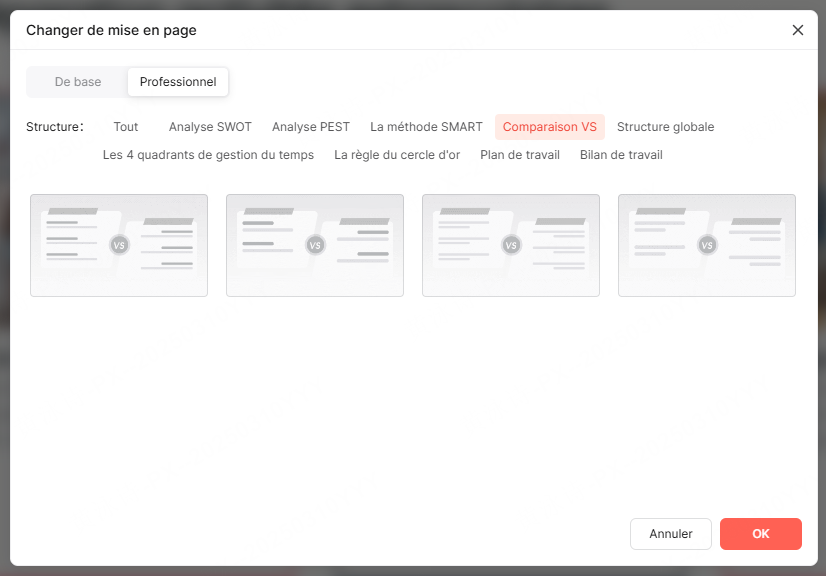 Ne gardez pas le tableau par défaut. Parcourez la bibliothèque de modèles et cherchez "Comparison" ou "Matrix". Sélectionnez un design qui offre beaucoup d'espace blanc (white space). La clarté est le luxe de l'intelligence. Un design aéré suggère que votre positionnement concurrentiel est limpide et sans équivoque.