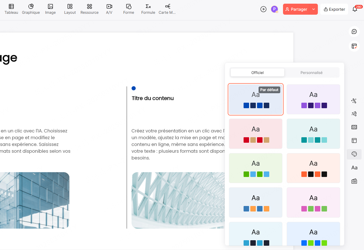 Appliquez votre thème dans Presenti avant d’ajouter des graphiques. Les couleurs, polices et styles de titres s’appliquent automatiquement, et vous pouvez sauvegarder le thème comme modèle pour réutilisation.