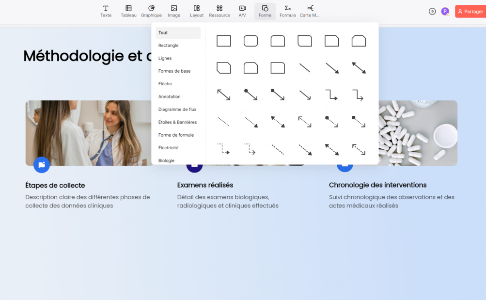 Ensuite, la bibliothèque de modèles de Presenti inclut des thèmes "Santé & Sciences". Oubliez les templates PowerPoint bariolés et distrayants. Ici, les fonds sont sobres (blanc clinique, bleu hôpital, gris neutre), les polices sont lisibles sans empattement, garantissant que l'attention reste focalisée sur les données médicales et non sur la décoration.