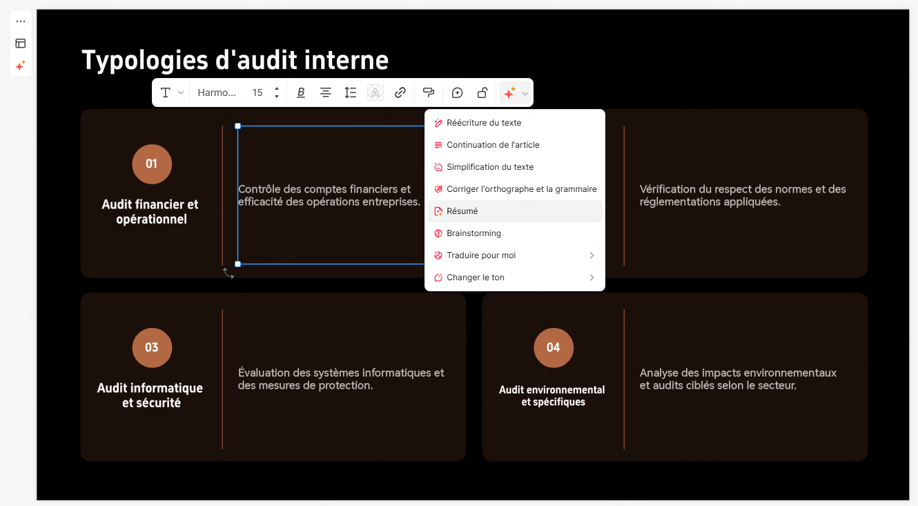 C'est souvent ici que le bât blesse : vos textes sont trop longs pour une diapositive. Utilisez l'IA de Presenti pour résumer. Sélectionnez un paragraphe dense de votre rapport d'audit interne expliquant une fraude complexe, et demandez à l'outil de le "résumer en 3 points clés". L'outil va conserver l'essence du message (le fait et le risque) tout en supprimant le jargon inutile pour la présentation orale.