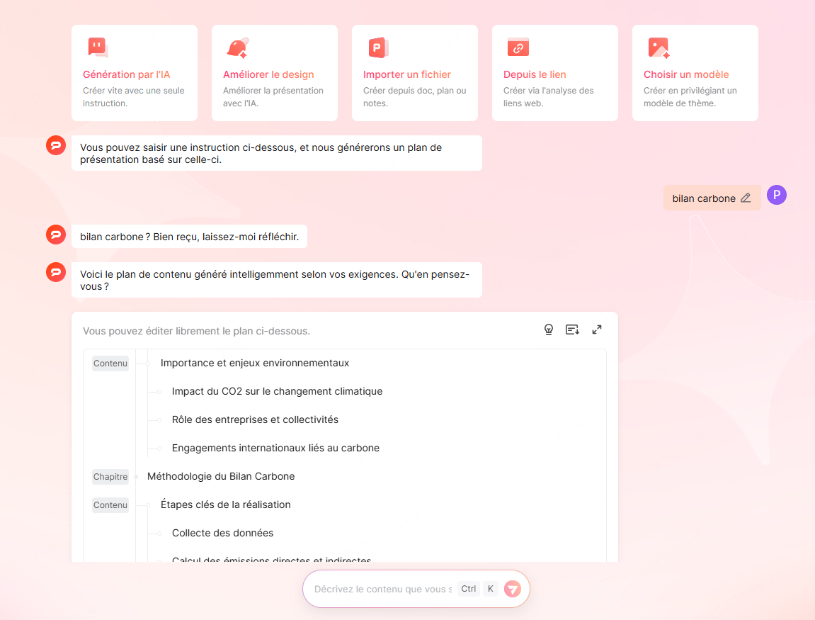 Ce créateur de présentation ia ne se contente pas de remplir des cases. Il organise le contenu en sections logiques, créant des diapositives de titre, des diapositives de contenu et des diapositives de conclusion, imitant ainsi le travail d'un consultant humain.