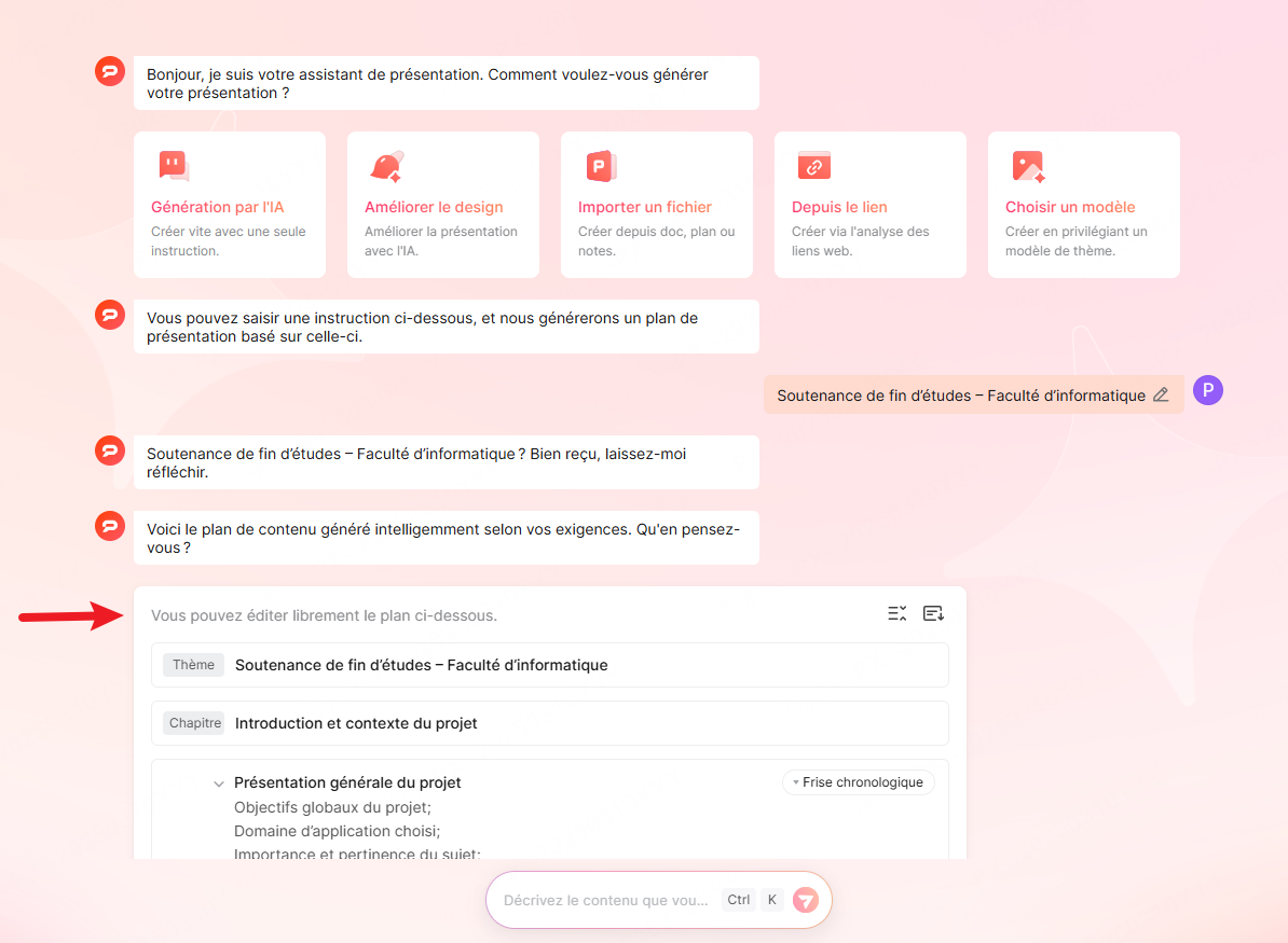 - Génération de plan structuré (Le cerveau) : Vous avez votre sujet d exposé ? Entrez-le dans Presenti. L'IA va analyser le thème et vous proposer un plan logique (Introduction, Arguments, Exemples, Conclusion). Si vous ne saviez pas comment faire un exposé au collège avec une structure claire, l'outil le fait pour vous.