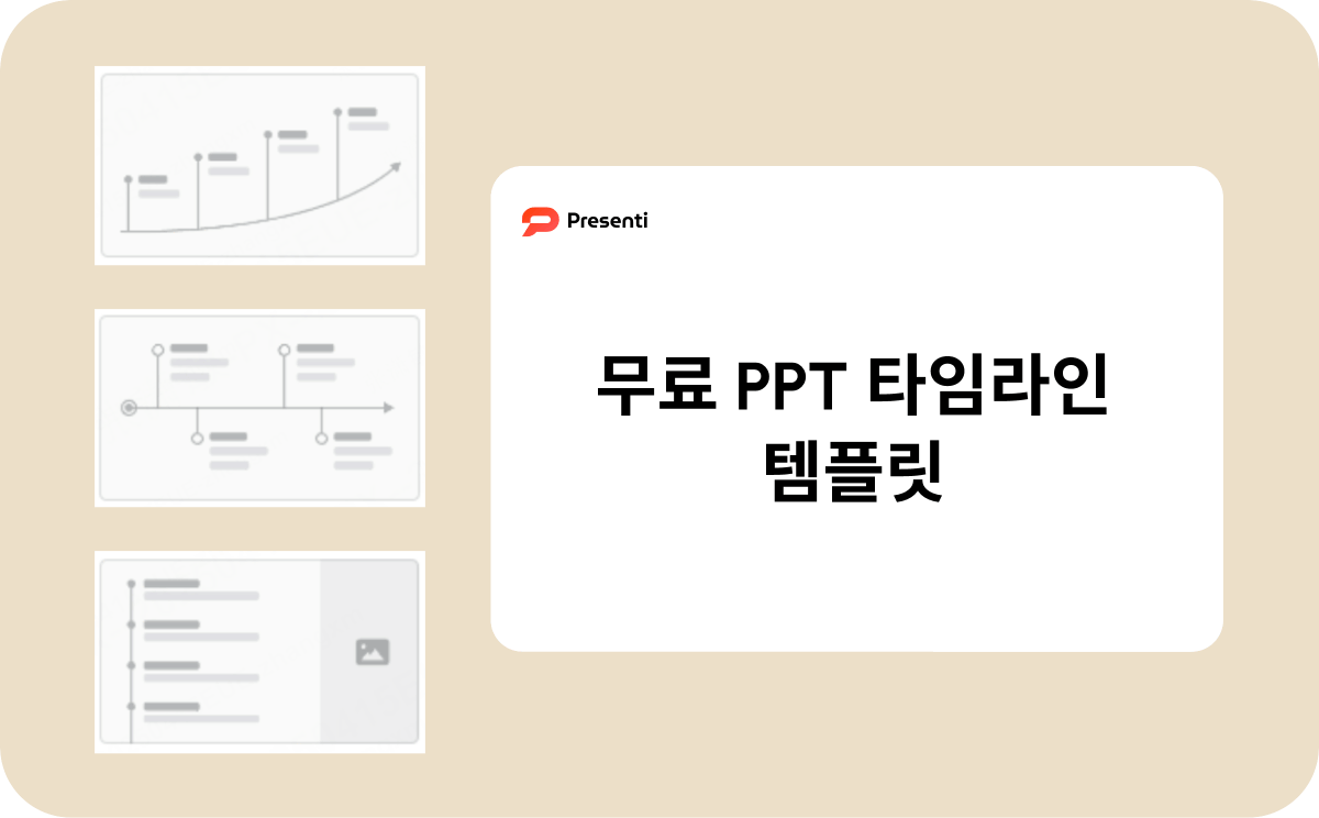 프레젠티(Presenti) 같은 AI 기반 도구를 활용하면 주제와 개요만 입력해도 타임라인이 포함된 PPT를 자동으로 생성할 수 있습니다. 다양한 스타일의 타임라인 템플릿을 제공하며, 콘텐츠와 디자인을 자동으로 조합해 시간과 노력을 크게 절약할 수 있습니다.